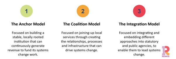 In our most recent Community of Practice meeting, Kezia Jackson-Harman, Principal Consultant in Place and Systems Change at Renaisi, talked us through three different models for sustaining place-based systems change that the team had identified through this inquiry: The Anchor Model, the Coalition Model, and the Integration Model.