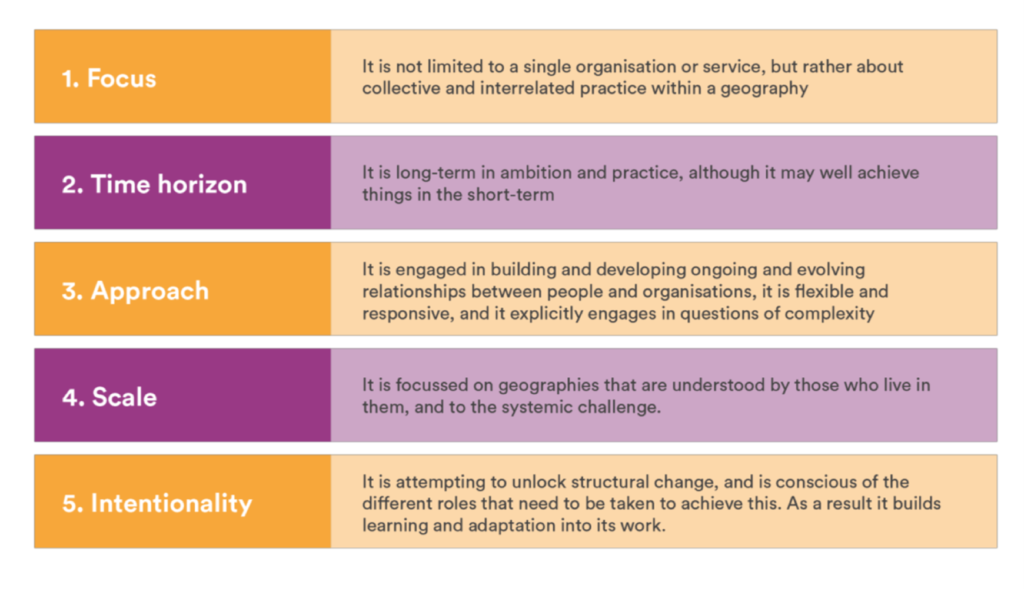 These models, alongside those shared in the previous session, are just a snapshot of those that have emerged in literature. As the inquiry progresses, they are likely to evolve and develop. Within the Community of Practice, we used them as a starting point for discussions about long-term resourcing for place-based systems change.